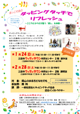 ほっこり会の開催日程は、協会ホームページのイベントカレンダーをご確認ください。タッピングタッチが初めての方も、ウェルカムです!